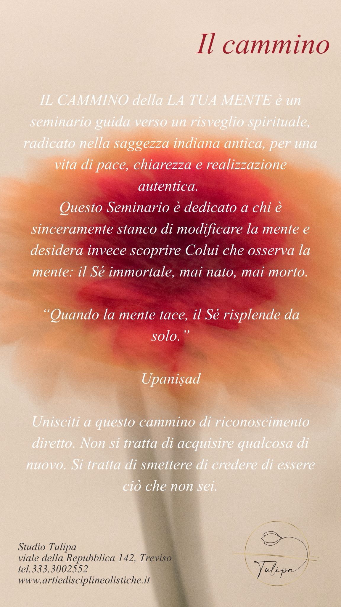 Un invito all’esperienza interiore che affronta la sofferenza attraverso la consapevolezza proattiva, come insegnato nelle Upanishad, conducendo all’abbondanza e alla manifestazione positiva mediante l’allineamento del subconscio con principi vedici eterni. In sintesi, “Trasforma la Tua Mente” guida verso un risveglio spirituale, radicato nella saggezza indiana antica, per una vita di pace, chiarezza e realizzazione autentica. Questo Seminario è dedicato a chi è sinceramente stanco di modificare la mente e desidera invece scoprire Colui che osserva la mente: il Sé immortale, mai nato, mai morto.